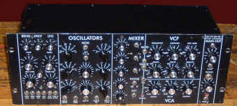 A new control board, for MIDI, with copies of the original envelope generators. The VCO board is a copy of the Minimoog D2 board. Controls are not original, nor are the printed board sockets. These are a better, gold plated flat blade type. The MIDIMOOG, not pictured, looks pretty much the same. This uses more Moog parts, including the D1 oscillator board, original mains transformer, wiring loom, rotary controls & board sockets. As these parts are old, they are prone to intermittency problems, the compact box makes service difficult. With more original parts, Moog was included in the name. Both models hum a bit, due to the compact layout, placing the mains transformer close to audio circuits. If this is a problem we modifiy them to resolve it. Board proximity often also causes keying clicks. Not so good overall as the original donor synth, which, after all, can have a MIDI converter, free standing or built in. If you like them, both are a reasonable buy, as long as the price is right. If you really want a modern rack unit that sounds like a Minimoog, then you are now catered for by Moog themselves. They have introduced a rack edition of the Minimoog Voyager. At today's (26-2-5) exchange rate of 1.923 it costs £1,141.42, less than an original Minimoog D2 in good nick. Of course you have to get it over here, U.K. price is £1,299.99, not bad as transport, VAT & Customs duty are included. Studio Electronics also fitted two Oberheim 2 or 4 Voice modules in a rack with MIDI. This is a reasonably good unit, up to a point. It just seems a shame that classics have to be sacrificed to make something a bit more modern but otherwise less. Safety.