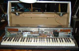 After tightening reeds, most are sharp, requiring re-weighting, one has NO weight, only making a faint ping. Many have no sustain, needs a new set. Some pickups had been bent with pliers, requiring a strip-down, beating flat & reprofiling. The amplifier has poor sound, low level & a bit distorted. Needs a good service & some new parts. Speakers have poor treble, the cones have become soft & fluffy with age.